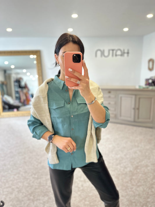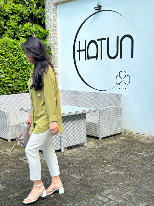 High Collar Long Sleeve Blouse With Side Slit in Oil Green