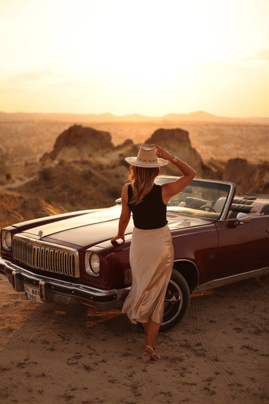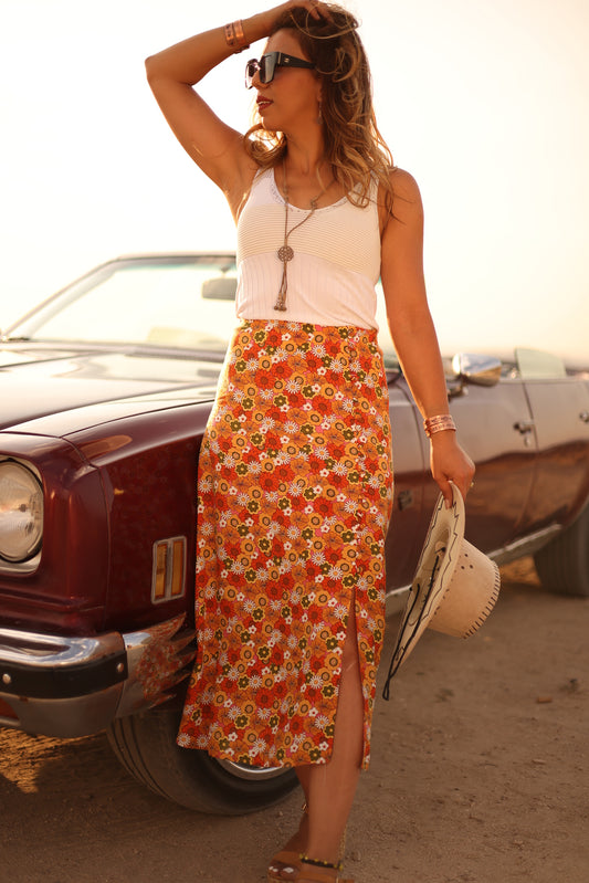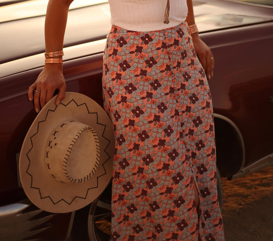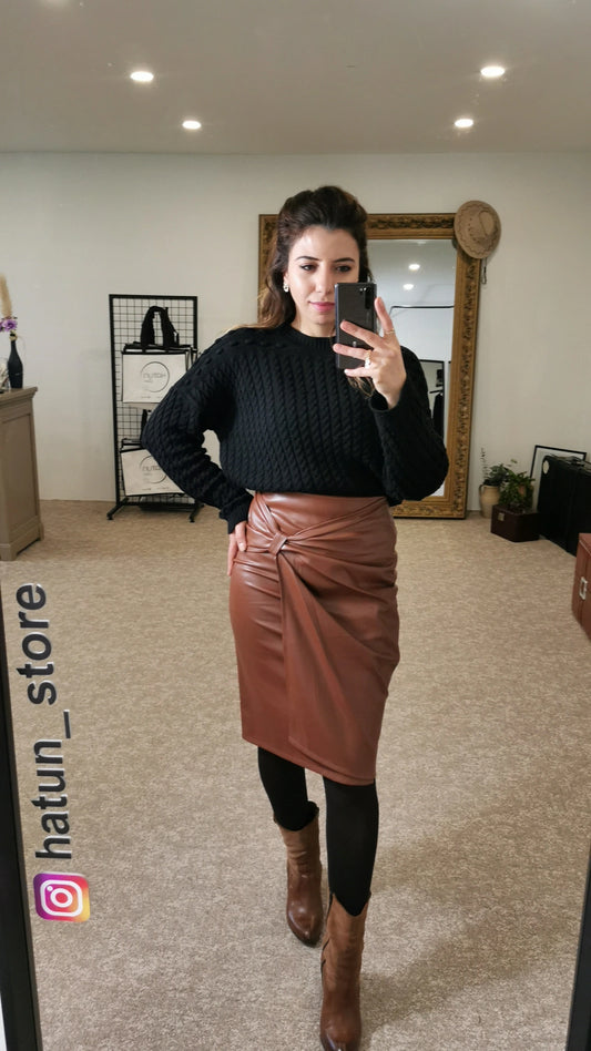 HIGH WAISTED VEGAN LEATHER WRAP-UP SKIRT, COGNAC