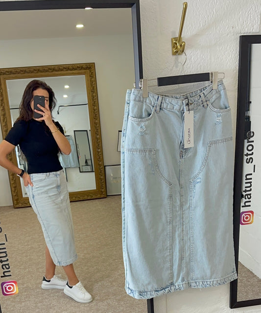 Pencil Skirt With Slit and Gold Buttons - Beige