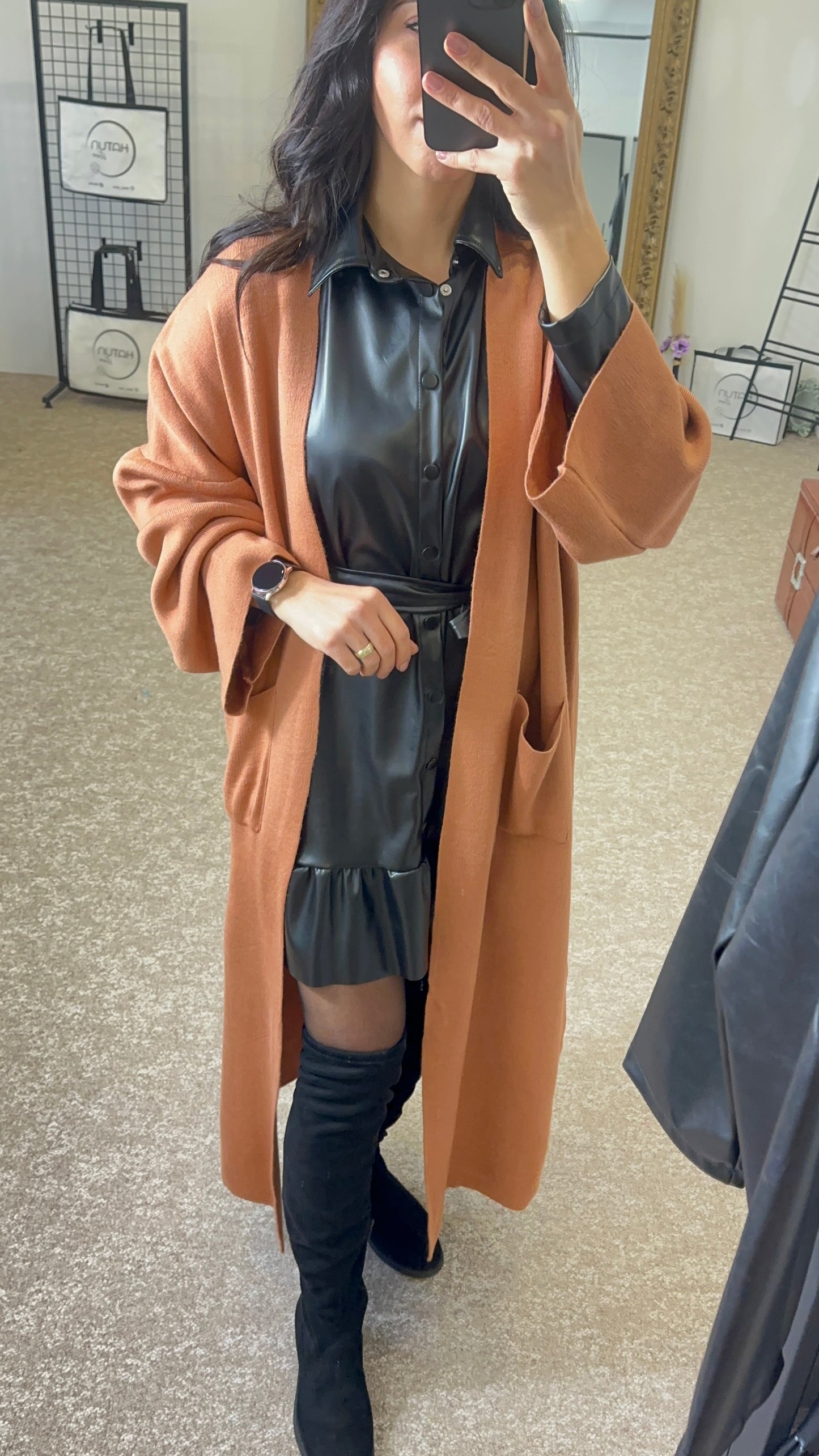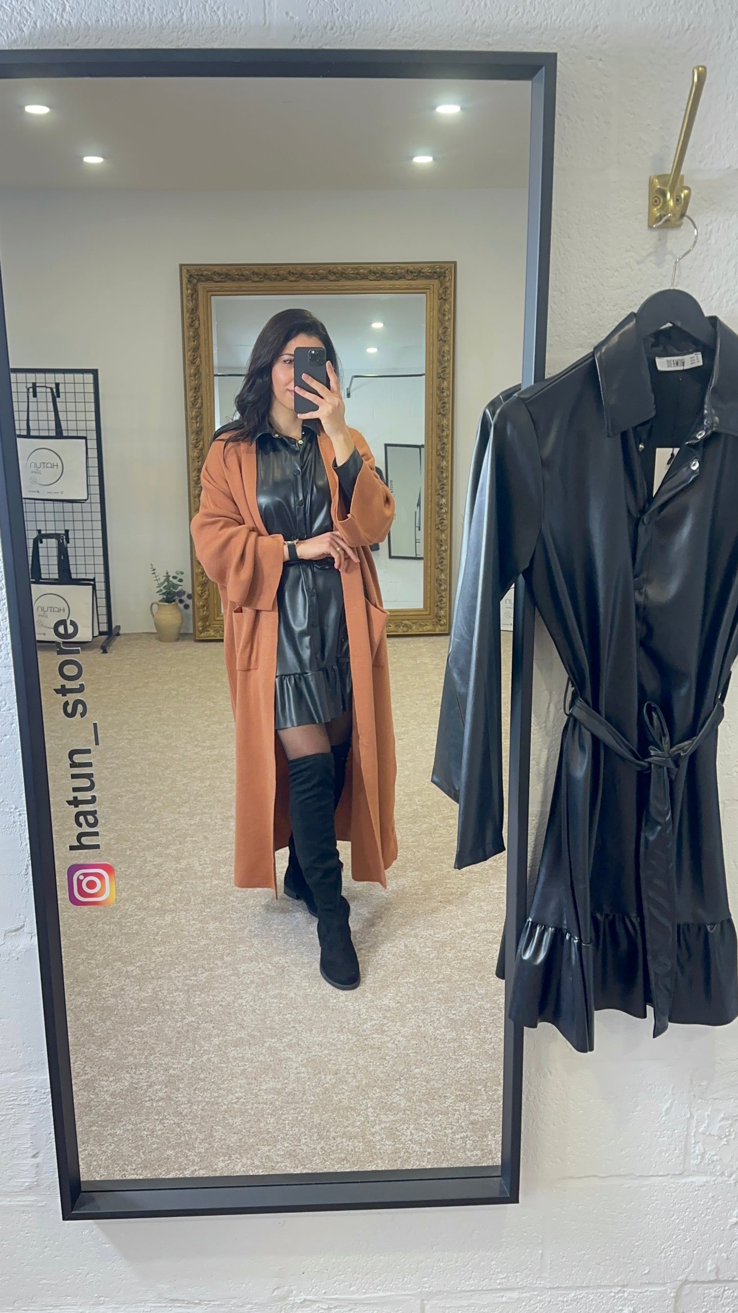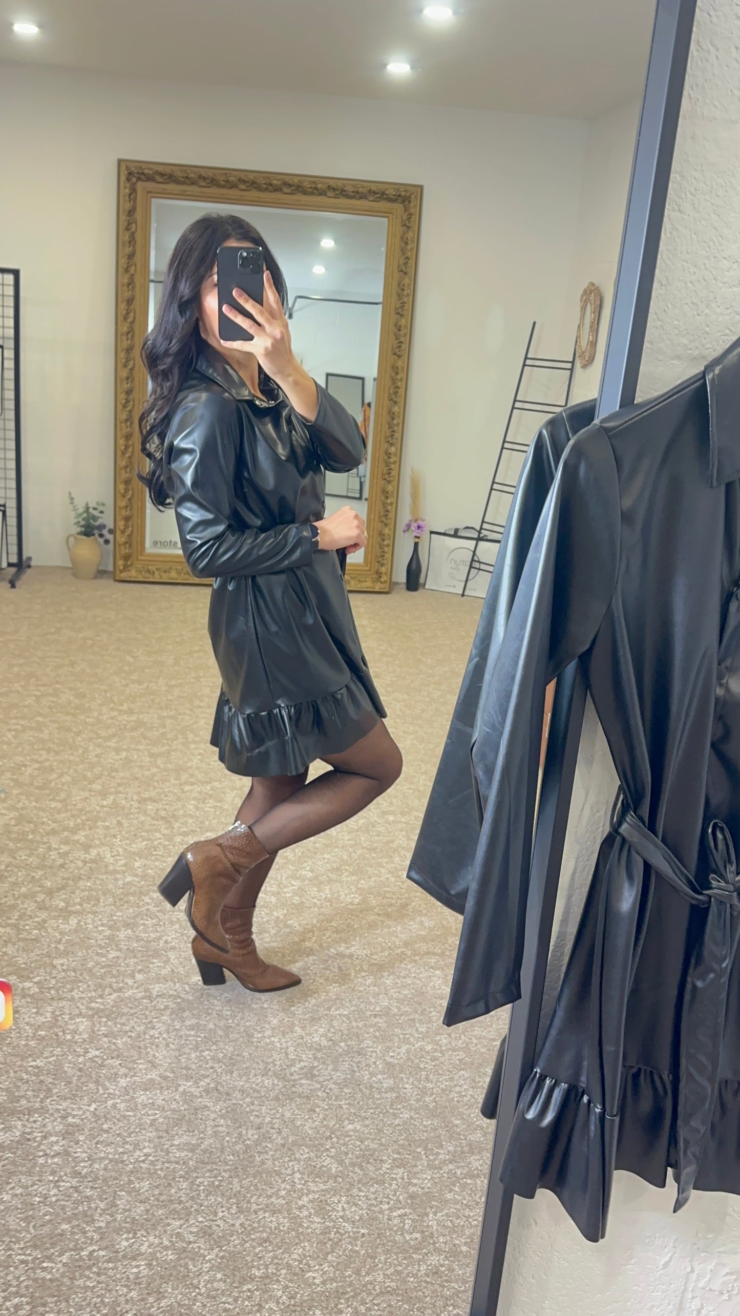 Our ruffled leather dress is very bold with its mini size. With his own fabric belt.
